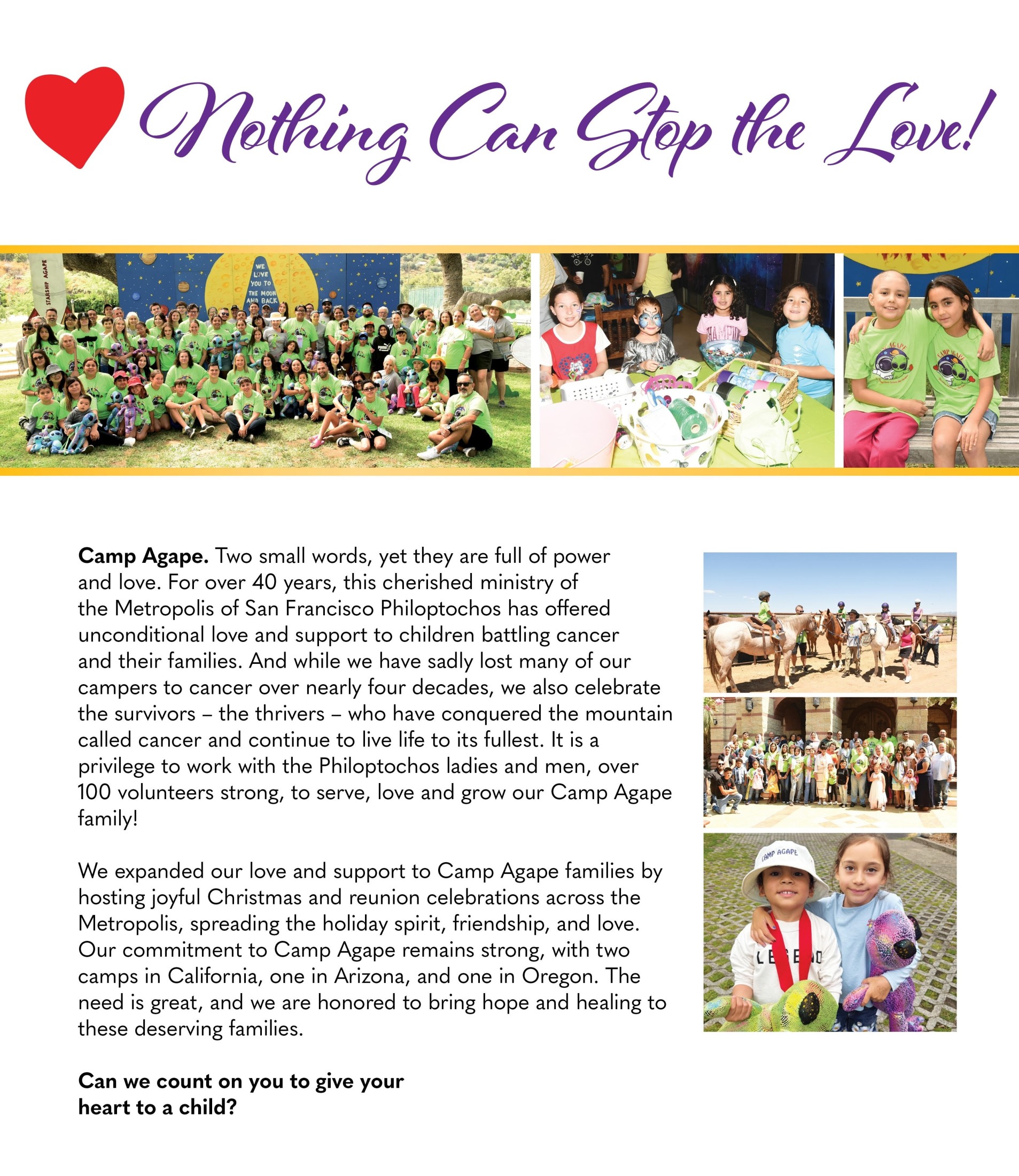 Today, I ask each of you to reflect on the countless ways you can make a difference. Think of the person who may be struggling in silence, the family that feels lost, or the community that is in need of a helping hand. How can we, reach out and make a lasting impact? It starts with love, compassion, and the willingness to serve. It is with strength in our Faith, Hope in our abilities to do Good Works and Love for one another that we exemplify true philanthropy. Together, we can continue the work of our Lord and transform lives, one act of kindness at a time. We are the Army of Agape!